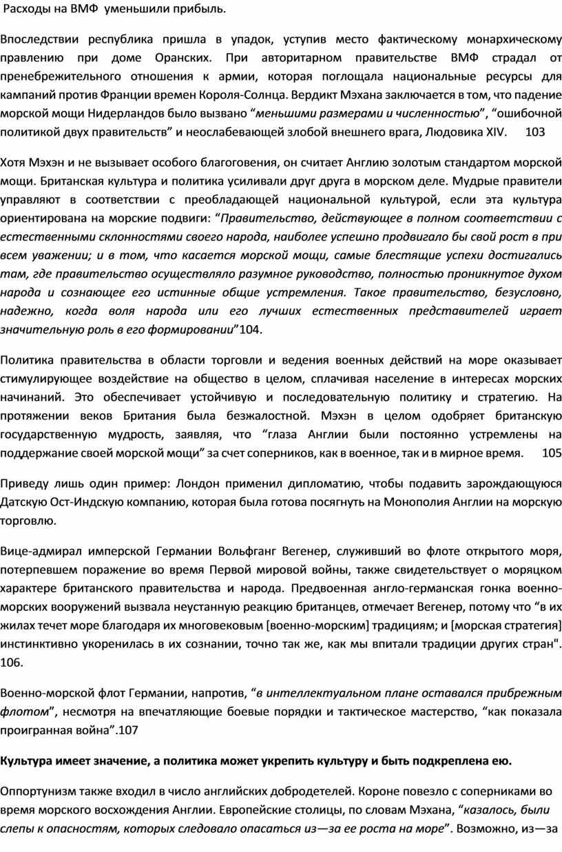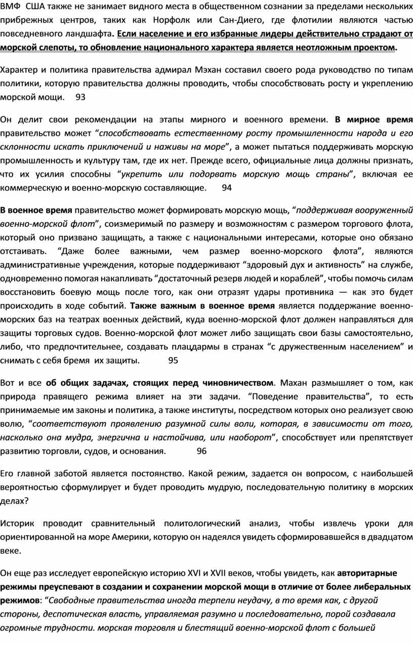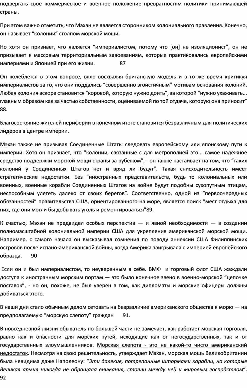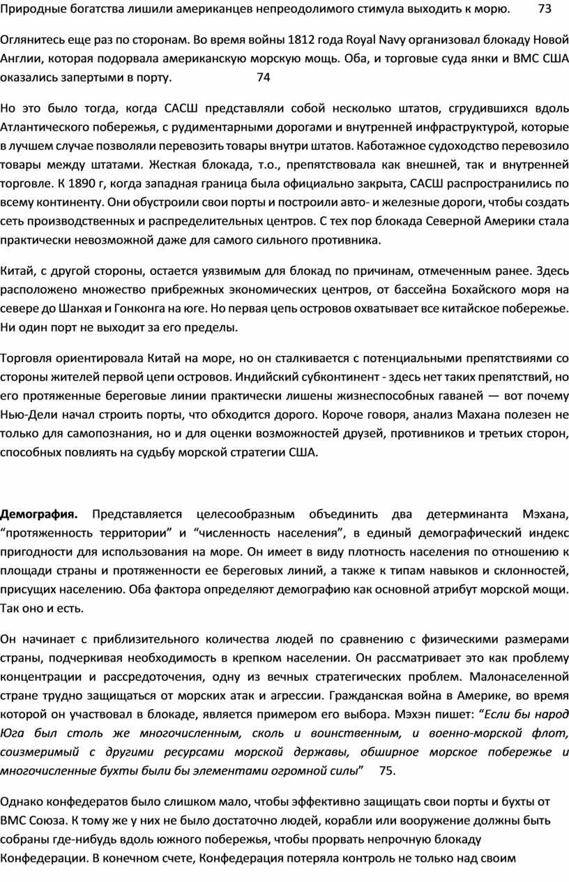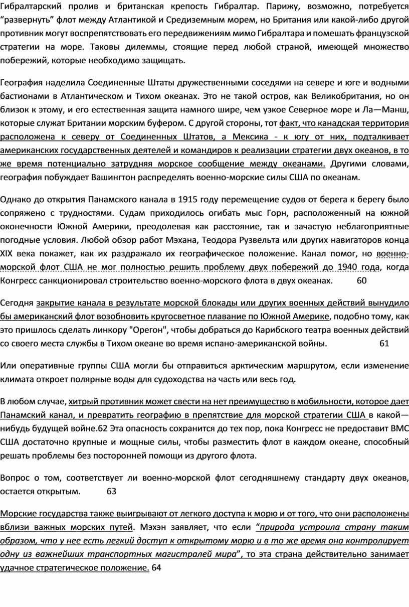 Таким образом, цель морской стратегии по Мэхану состоит в том, чтобы “обеспечить безопасность торговли с помощью политических мер, способствующих укреплению военной, или военно-морской, мощи". Этот порядок представляет собой соотношение трех элементов — коммерческого, политического и военного - для нации (выделено мной). 7