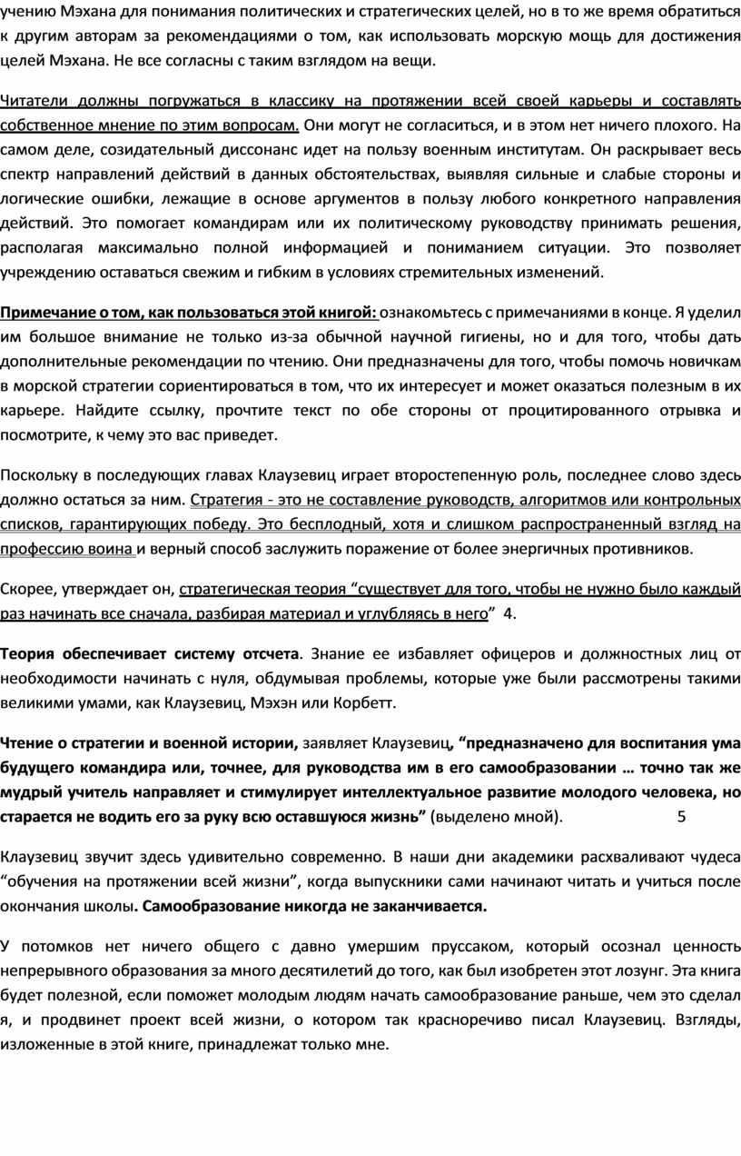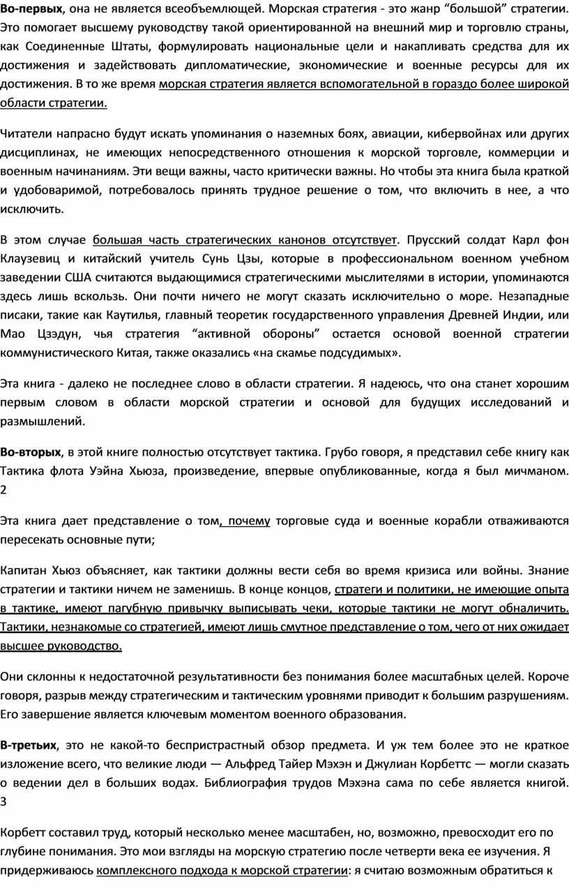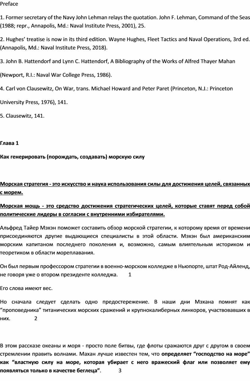 В-третьих, это не какой-то беспристрастный обзор предмета. И уж тем более это не краткое изложение всего, что великие люди — Альфред Тайер Мэхэн и Джулиан Корбеттс — могли сказать о ведении дел в больших водах. Библиография трудов Мэхэна сама по себе является книгой. 3