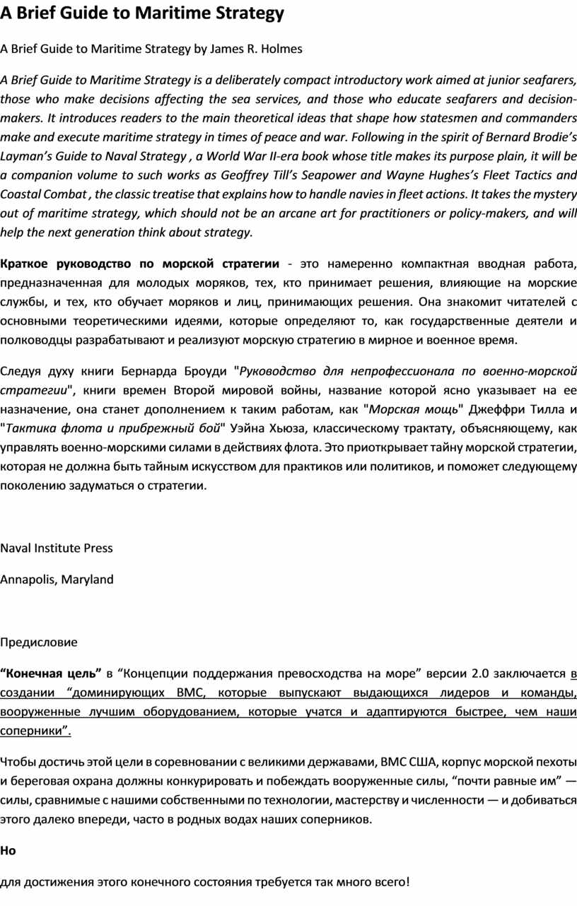 Краткое руководство по морской стратегии - это намеренно компактная вводная работа, предназначенная для молодых моряков, тех, кто принимает решения, влияющие на морские службы, и тех, кто обучает моряков и лиц, принимающих решения. Она знакомит читателей с основными теоретическими идеями, которые определяют то, как государственные деятели и полководцы разрабатывают и реализуют морскую стратегию в мирное и военное время.