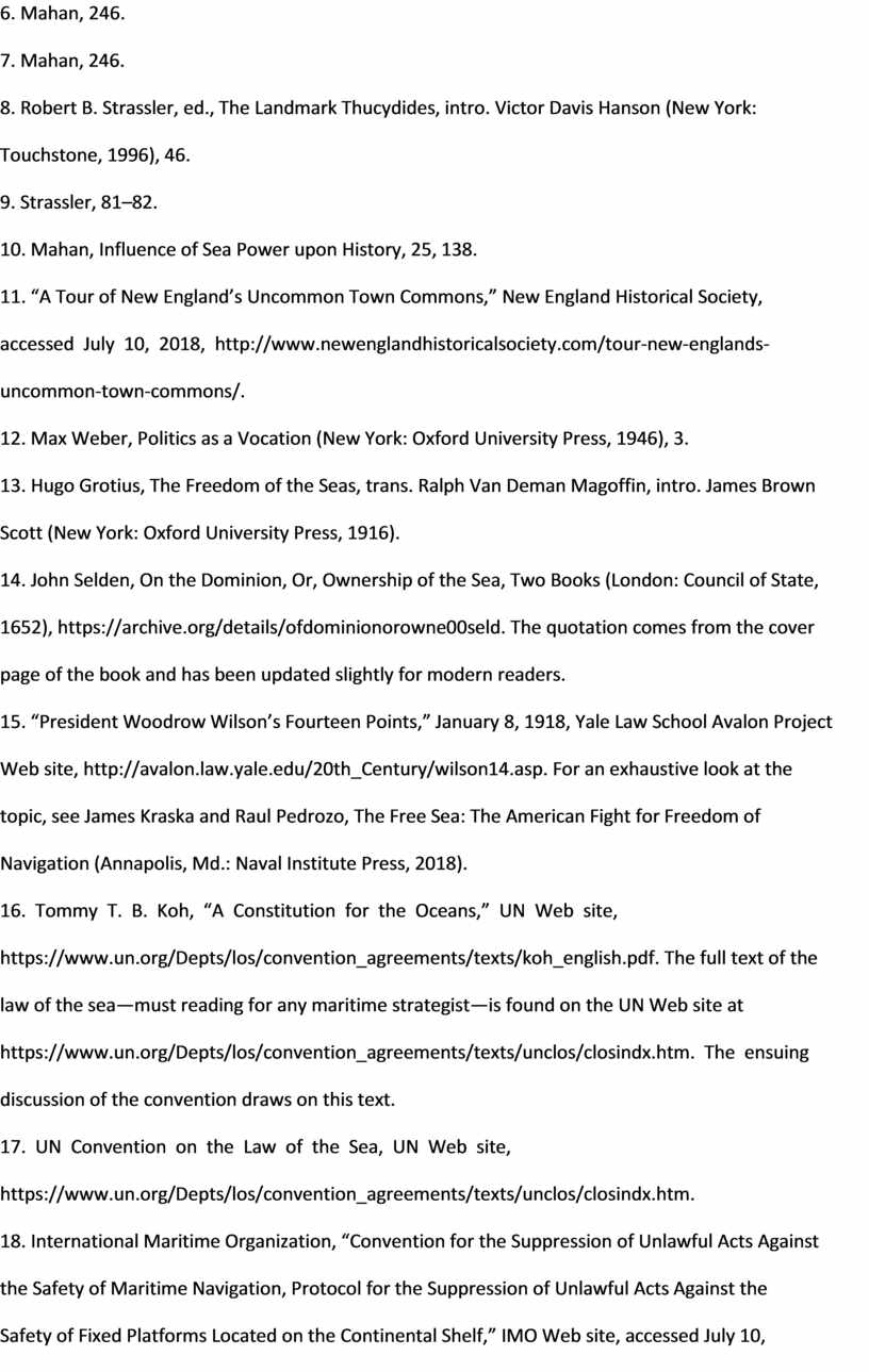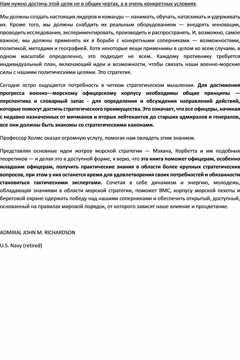 Представляя основные идеи мэтров морской стратегии — Мэхана, Корбетта и им подобных теоретиков — и делая это в доступной форме, я верю, что эта книга поможет офицерам, особенно младшим офицерам, получить практические знания в области более крупных стратегических вопросов, при этом у них останется время для удовлетворения своих потребностей и обязанности становиться тактическими экспертами. Сочетая в себе динамизм и энергию, молодежь, обладающая знаниями в области морской стратегии, поможет ВМС, корпусу морской пехоты и береговой охране одержать победу над нашими соперниками и обеспечить открытый, доступный, основанный на правилах мировой порядок, от которого зависят наше влияние и процветание.