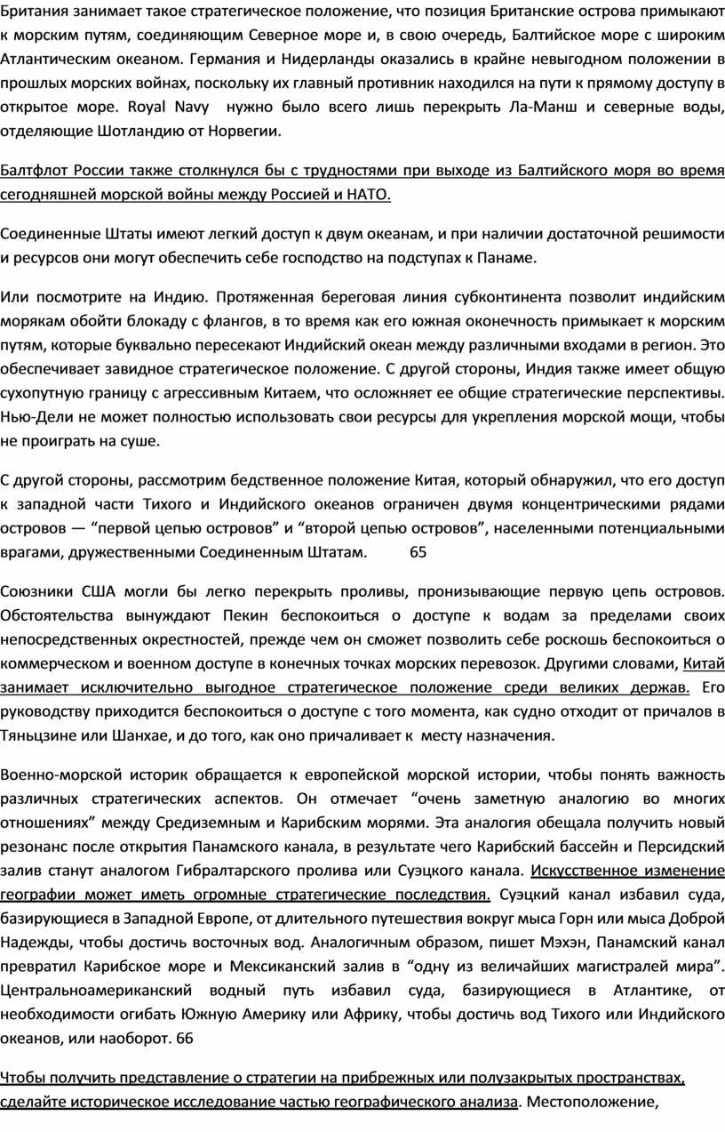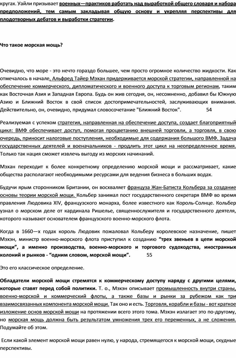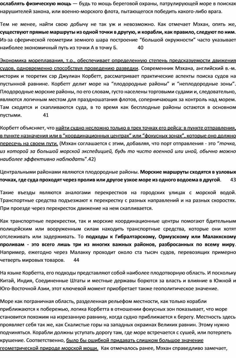 Корбетт составил труд, который несколько менее масштабен, но, возможно, превосходит его по глубине понимания. Это мои взгляды на морскую стратегию после четверти века ее изучения. Я придерживаюсь комплексного подхода к морской стратегии: я считаю возможным обратиться к учению Мэхана для понимания политических и стратегических целей, но в то же время обратиться к другим авторам за рекомендациями о том, как использовать морскую мощь для достижения целей Мэхана. Не все согласны с таким взглядом на вещи.