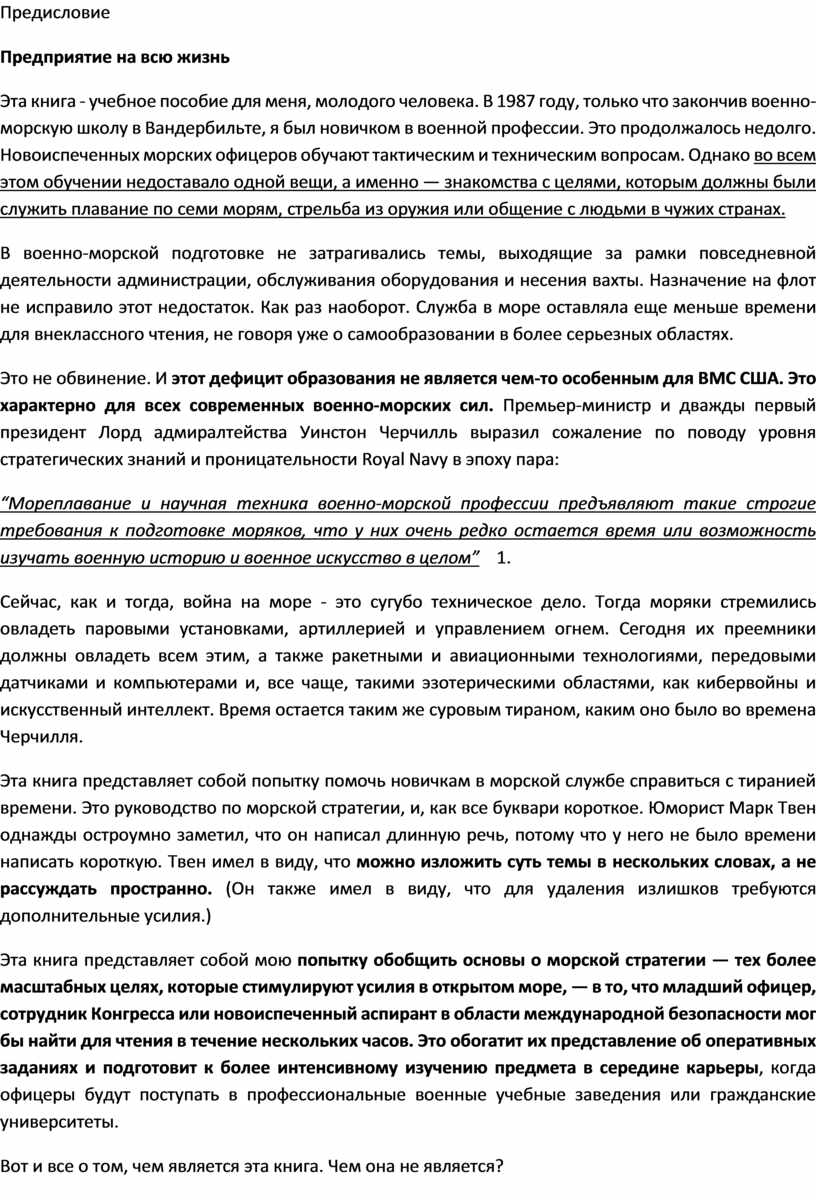 Эта книга представляет собой попытку помочь новичкам в морской службе справиться с тиранией времени. Это руководство по морской стратегии, и, как все буквари короткое. Юморист Марк Твен однажды остроумно заметил, что он написал длинную речь, потому что у него не было времени написать короткую. Твен имел в виду, что можно изложить суть темы в нескольких словах, а не рассуждать пространно. (Он также имел в виду, что для удаления излишков требуются дополнительные усилия.)