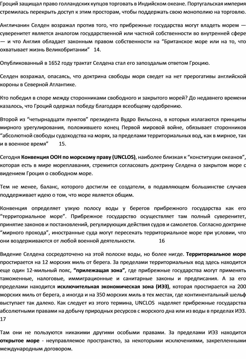 Англичанин Селден возражал против того, что прибрежные государства могут владеть морем — суверенитет является аналогом государственной или частной собственности во внутренней сфере — и что Англия обладает законным правом собственности на “Британское море или на то, что охватывает жизнь Великобритании” 14.