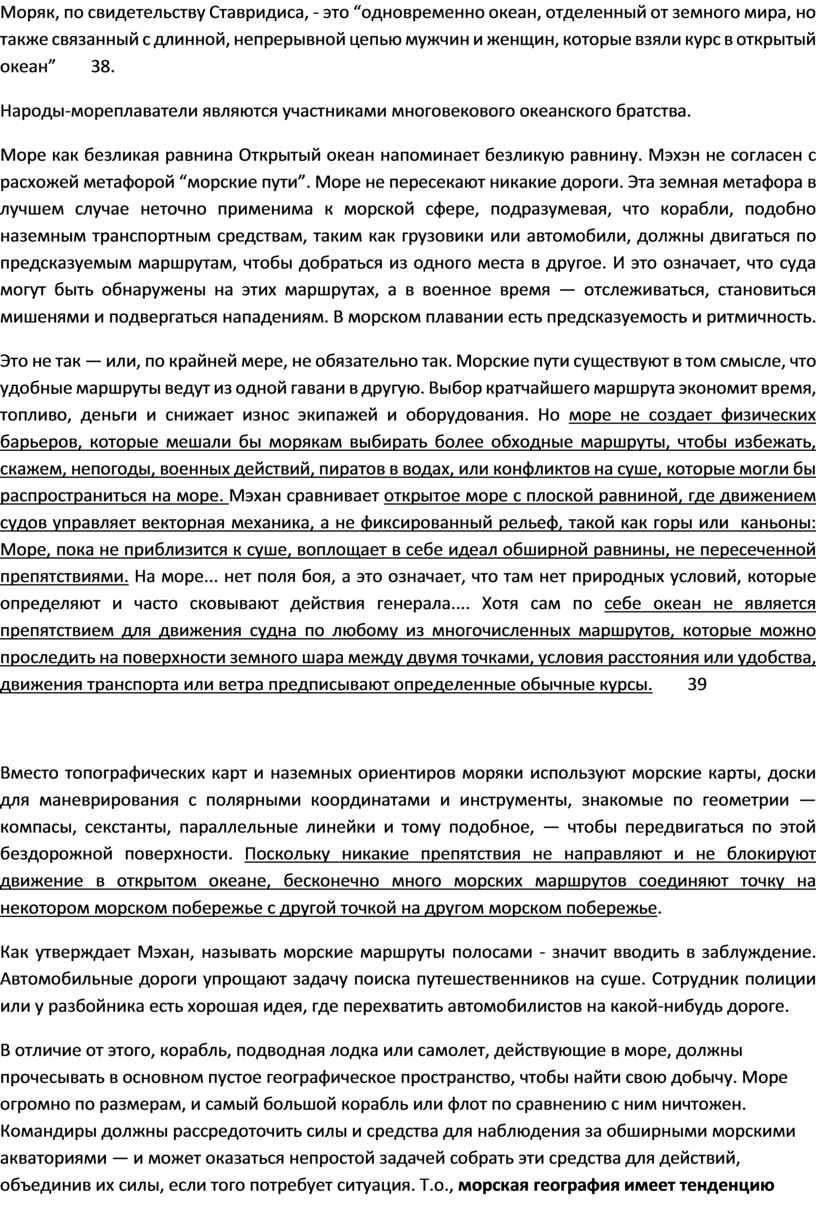 Отчасти океаны являются тем, чем их считают люди. Мэхэн был первым, кто назвал море “широким общим пространством” или “великим общим”. Он описал это как “большое шоссе”, или, лучше сказать, “широкую пустошь, по которой люди могут передвигаться во всех направлениях, но на которой некоторые хорошо проторенные тропинки показывают, что руководящие причины заставили их выбрать определенные маршруты передвижения, а не другие. Эти пути передвижения называются торговыми путями.” 10