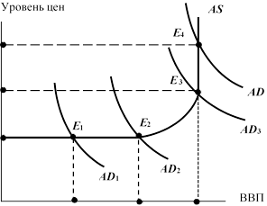 Увеличение совокупного спроса на горизонтальном отрезке кривой AS вызывает рост совокупного предложения при неизменном уровне цен. Макроэкономическое равновесие складывается в точке Е2.