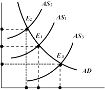 В результате действия неценовых факторов происходит смеще- ние кривой совокупного предложения AS1 влево в положение AS2. Реальный объем национального продукта уменьшится от ВВП1 до ВВП2, а общий уровень цен возрастет от Р2 до Р3. Макроэкономи- ческое равновесие установится в точке Е2.