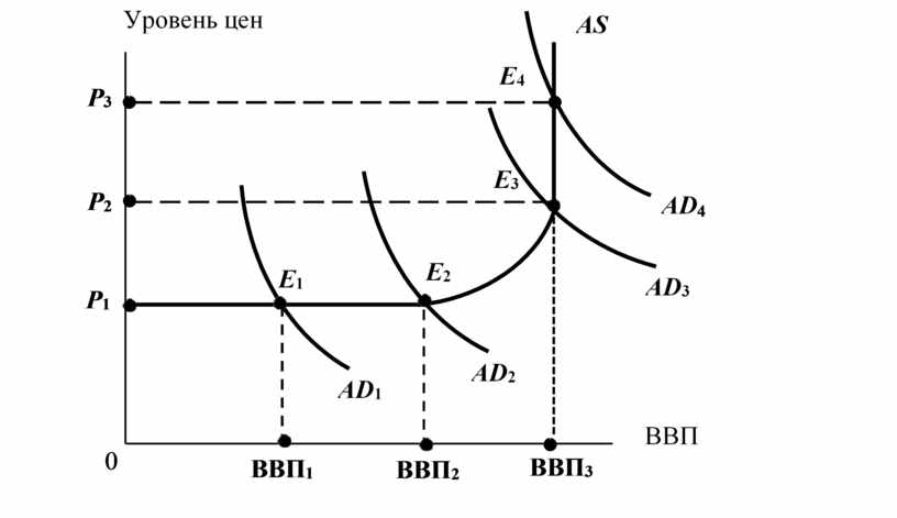 Если произошло повышение совокупного спроса от AD1 до AD2, рост объема валового продукта от ВВП2 до максимального уровня ВВП3 и увеличение уровня цен от Р1 до Р2, макроэкономическое равновесие установилось в точке Е3.