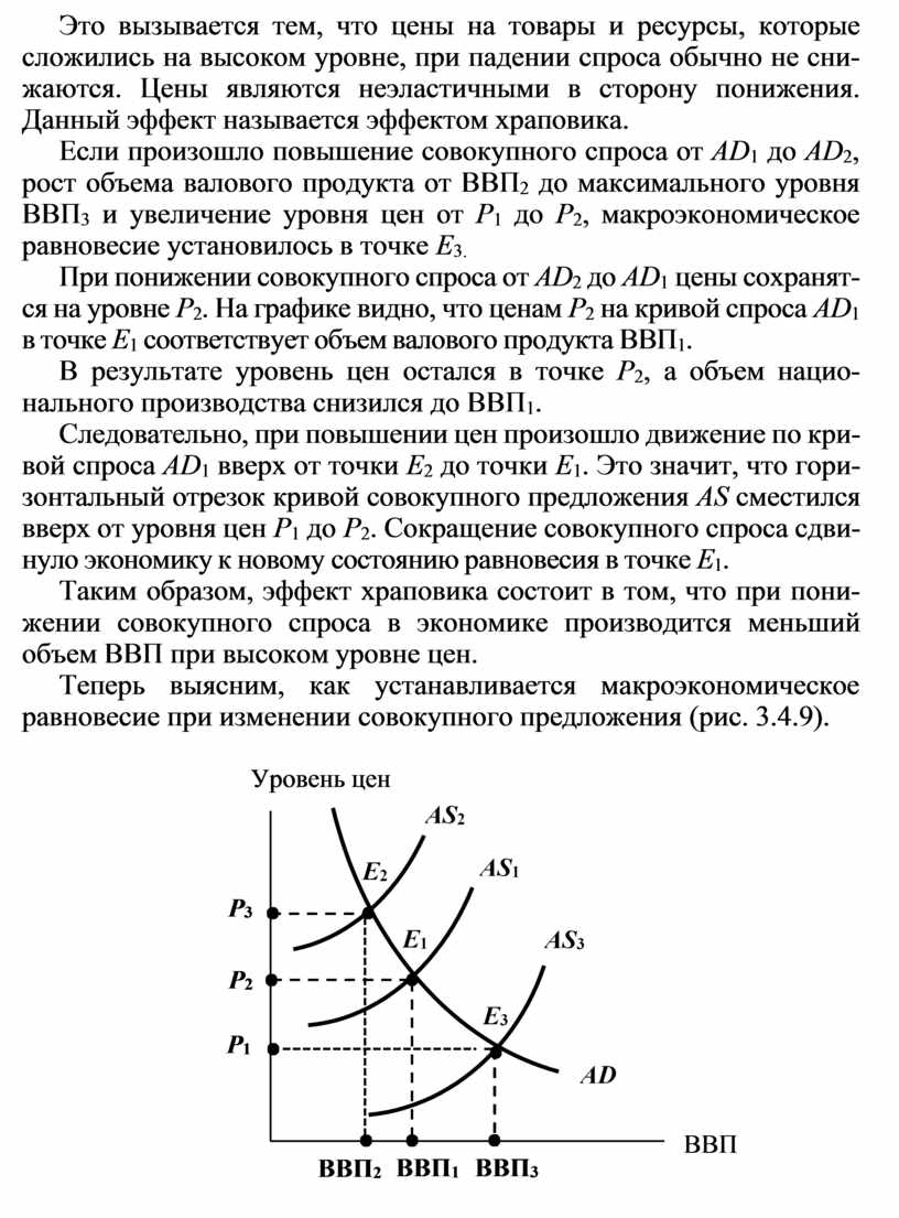 В результате устанавливается макроэкономическое равновесие в точке Е3 при пересечении кривых совокупного спроса AD и сово- купного предложения AS при максимально возможном реальном объеме валового продукта ВВП3 и общем уровне цен Р2.