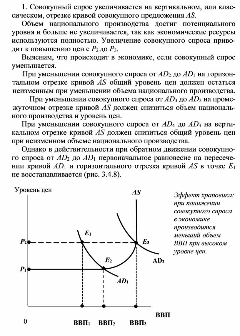 При уменьшении совокупного спроса от AD4 до AD3 на верти- кальном отрезке кривой AS должен снизиться общий уровень цен при неизменном объеме национального производства.