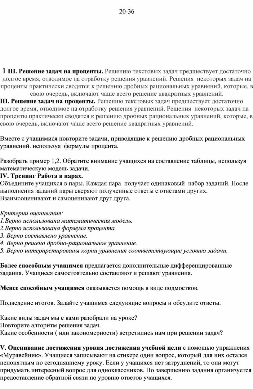 III. Решение задач на проценты. Решению текстовых задач предшествует достаточно долгое время, отводимое на отработку решения уравнений. Решения некоторых задач на проценты практически сводятся к решению дробных рациональных уравнений, которые, в свою очередь, включают чаще всего решение квадратных уравнений.