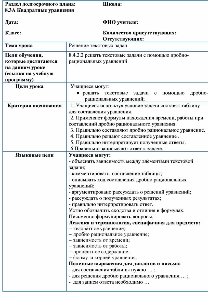 Учащиеся могут: объяснять зависимость между элементами текстовой задачи; комментировать составление таблицы; описывать ход составления дробно рациональных уравнений; аргументировано рассуждать о решений уравнений; - рассуждать о полученных результатах; - правильно интерпретировать ответ. Устно обозначить сходства и отличия в формулах. Письменно формулировать вопросы. Лексика и терминология, специфичная для предмета: - квадратное уравнение; - дробно рациональное уравнение; - зависимость от времени; - зависимость от работы; - процентное содержание; - формула корней уравнения. Полезные выражения для диалогов и письма: - для составления таблицы нужно … ; - для решения дробно рационального уравнения…. ; - для записи ответа необходимо …