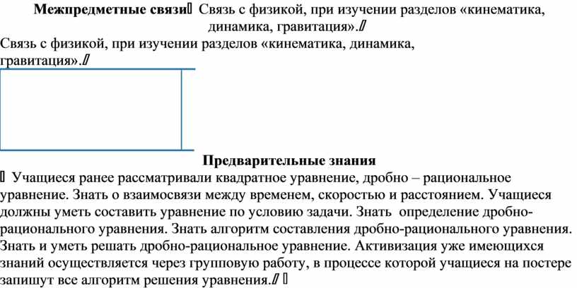 Учащиеся ранее рассматривали квадратное уравнение, дробно – рациональное уравнение. Знать о взаимосвязи между временем, скоростью и расстоянием. Учащиеся должны уметь составить уравнение по условию задачи. Знать определение дробно-рационального уравнения. Знать алгоритм составления дробно-рационального уравнения. Знать и уметь решать дробно-рациональное уравнение. Активизация уже имеющихся знаний осуществляется через групповую работу, в процессе которой учащиеся на постере запишут все алгоритм решения уравнения. |