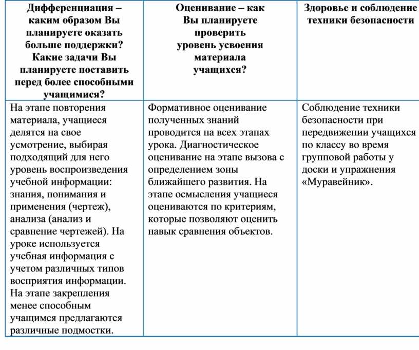 На этапе повторения материала, учащиеся делятся на свое усмотрение, выбирая подходящий для него уровень воспроизведения учебной информации: знания, понимания и применения (чертеж), анализа (анализ и сравнение чертежей). На уроке используется учебная информация с учетом различных типов восприятия информации. На этапе закрепления менее способным учащимся предлагаются различные подмостки. |