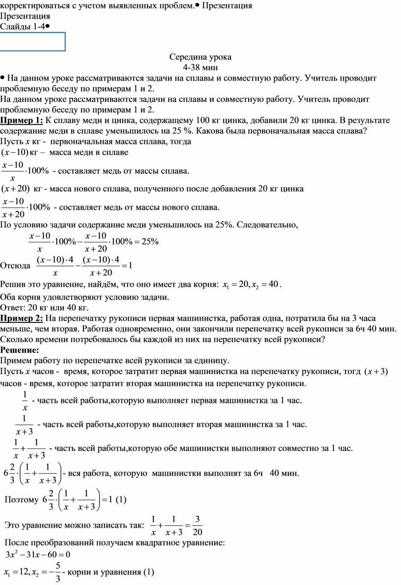 На данном уроке рассматриваются задачи на сплавы и совместную работу. Учитель проводит проблемную беседу по примерам 1 и 2.