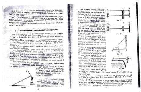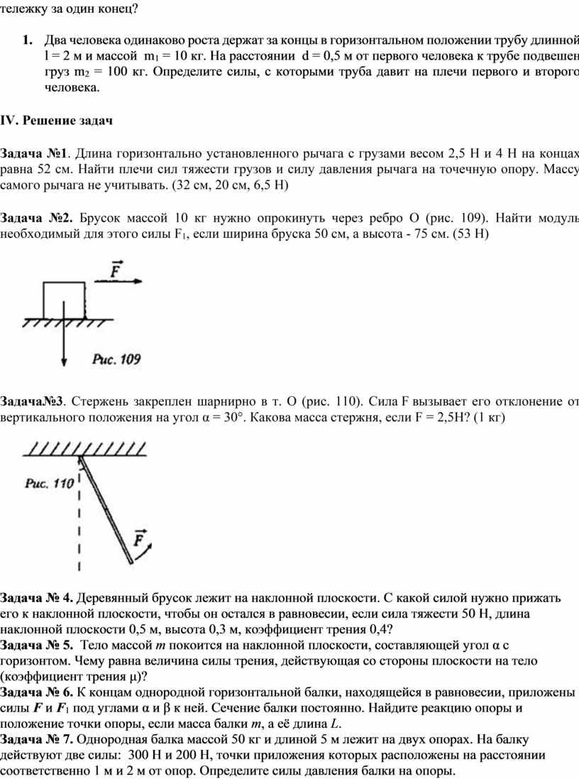 4. Два человека одинаково роста держат за концы в горизонтальном положении трубу длинной l = 2 м и массой m1 = 10 кг. На расстоянии d = 0,5 м от первого человека к трубе подвешен груз m2 = 100 кг. Определите силы, с которыми труба давит на плечи первого и второго человека. IV. Решение задач Задача №1. Длина горизонтально установленного рычага с грузами весом 2,5 Н и 4 Н на концах равна 52 см. Найти плечи сил тяжести грузов и силу давления рычага на точечную опору. Массу самого рычага не учитывать. (32 см, 20 см, 6,5 Н) Задача №2. Брусок массой 10 кг нужно опрокинуть через ребро О (рис. 109). Найти модуль необходимый для этого силы F1, если ширина бруска 50 см, а высота - 75 см. (53 Н)