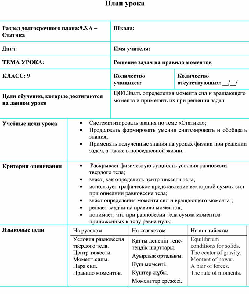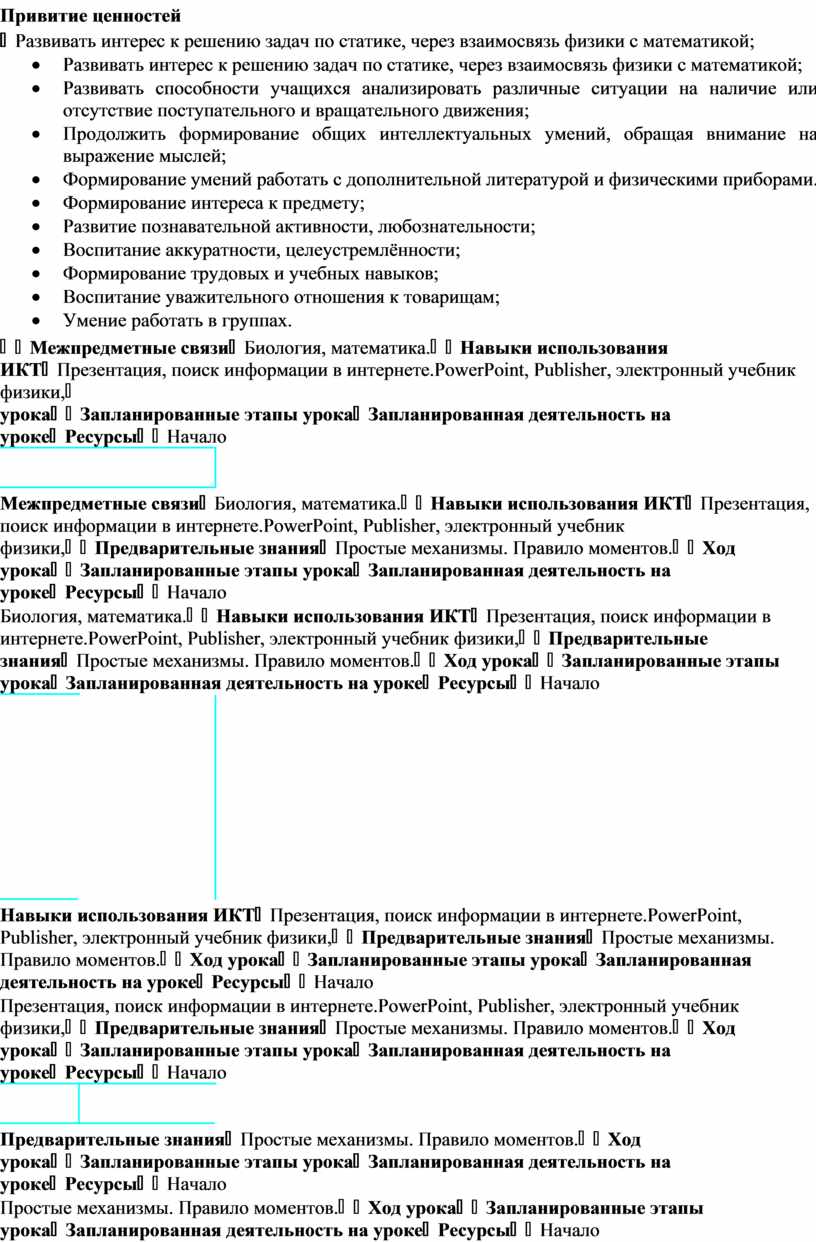 · Развивать интерес к решению задач по статике, через взаимосвязь физики с математикой; · Развивать способности учащихся анализировать различные ситуации на наличие или отсутствие поступательного и вращательного движения; · Продолжить формирование общих интеллектуальных умений, обращая внимание на выражение мыслей; · Формирование умений работать с дополнительной литературой и физическими приборами. · Формирование интереса к предмету; · Развитие познавательной активности, любознательности; · Воспитание аккуратности, целеустремлённости; · Формирование трудовых и учебных навыков; · Воспитание уважительного отношения к товарищам; · Умение работать в группах.