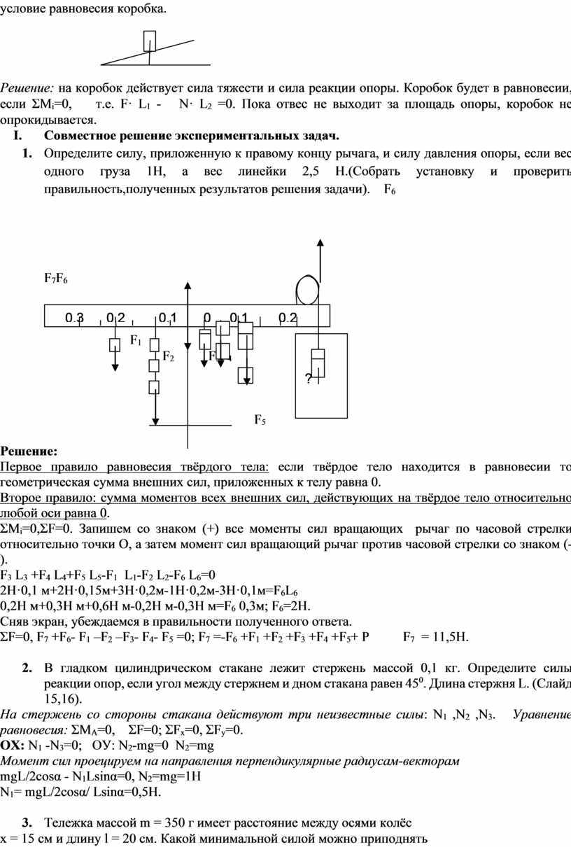 Решение: на коробок действует сила тяжести и сила реакции опоры. Коробок будет в равновесии, если ΣМi=0, т.е. F· L1 - N· L2 =0. Пока отвес не выходит за площадь опоры, коробок не опрокидывается. I. Совместное решение экспериментальных задач. 1. Определите силу, приложенную к правому концу рычага, и силу давления опоры, если вес одного груза 1Н, а вес линейки 2,5 Н.(Собрать установку и проверить правильность,полученных результатов решения задачи). F6
