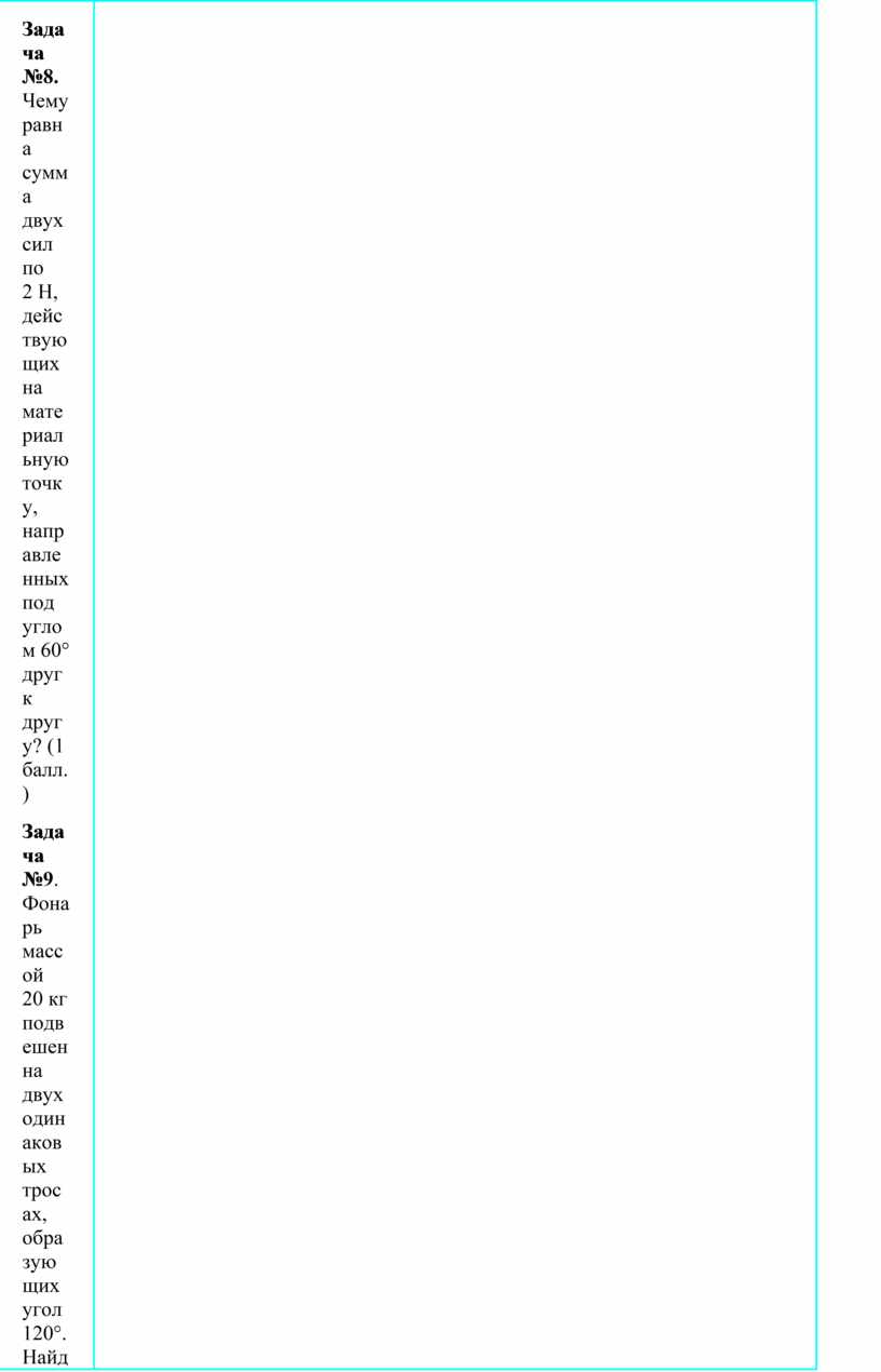 Задача № 4. Деревянный брусок лежит на наклонной плоскости. С какой силой нужно прижать его к наклонной плоскости, чтобы он остался в равновесии, если сила тяжести 50 Н, длина наклонной плоскости 0,5 м, высота 0,3 м, коэффициент трения 0,4? Задача № 5. Тело массой m покоится на наклонной плоскости, составляющей угол α с горизонтом. Чему равна величина силы трения, действующая со стороны плоскости на тело (коэффициент трения μ)? Задача № 6. К концам однородной горизонтальной балки, находящейся в равновесии, приложены силы F и F1 под углами α и β к ней. Сечение балки постоянно. Найдите реакцию опоры и положение точки опоры, если масса балки m, а её длина L. Задача № 7. Однородная балка массой 50 кг и длиной 5 м лежит на двух опорах. На балку действуют две силы: 300 Н и 200 Н, точки приложения которых расположены на расстоянии соответственно 1 м и 2 м от опор. Определите силы давления балки на опоры. Задача №8. Чему равна сумма двух сил по 2 Н, действующих на материальную точку, направленных под углом 60° друг к другу? (1 балл.) Задача №9. Фонарь массой 20 кг подвешен на двух одинаковых тросах, образующих угол 120°. Найдите силу натяжения тросов. (2 балла.) Задача №10. Какая из физических величин имеет наименование кг · м2/с2? (1 балл.) Задача №11. Чему равна сумма моментов двух сил:F1 = 3 Н и F2 = 4 Н, приложенных в точке, лежащей на ободе диска радиусом 1 м, который вращается вокруг оси? F1 направлена по радиусу к центру диска, F2 – перпендикулярно радиусу. (2 балла.) Дополнительные задания.