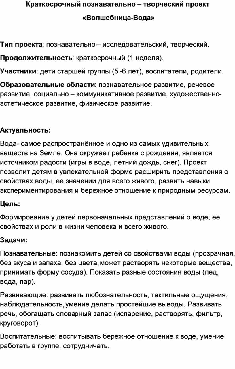 Вода- самое распространённое и одно из самых удивительных веществ на Земле. Она окружает ребенка с рождения, является источником радости (игры в воде, летний дождь, снег). Проект позволит детям в увлекательной форме расширить представления о свойствах воды, ее значении для всего живого, развить навыки экспериментирования и бережное отношение к природным ресурсам.