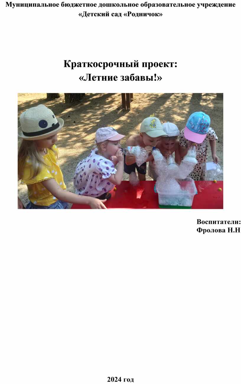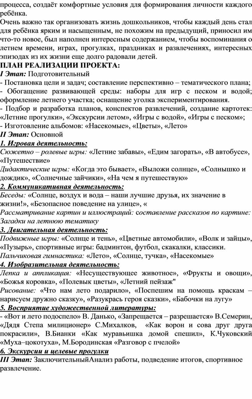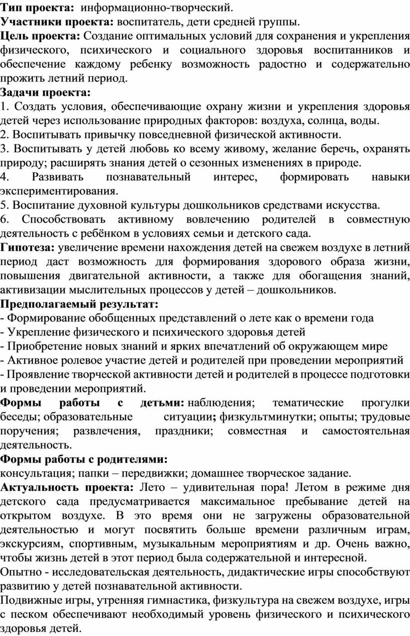 Актуальность проекта: Лето – удивительная пора! Летом в режиме дня детского сада предусматривается максимальное пребывание детей на открытом воздухе. В это время они не загружены образовательной деятельностью и могут посвятить больше времени различным играм, экскурсиям, спортивным, музыкальным мероприятиям и др. Очень важно, чтобы жизнь детей в этот период была содержательной и интересной.