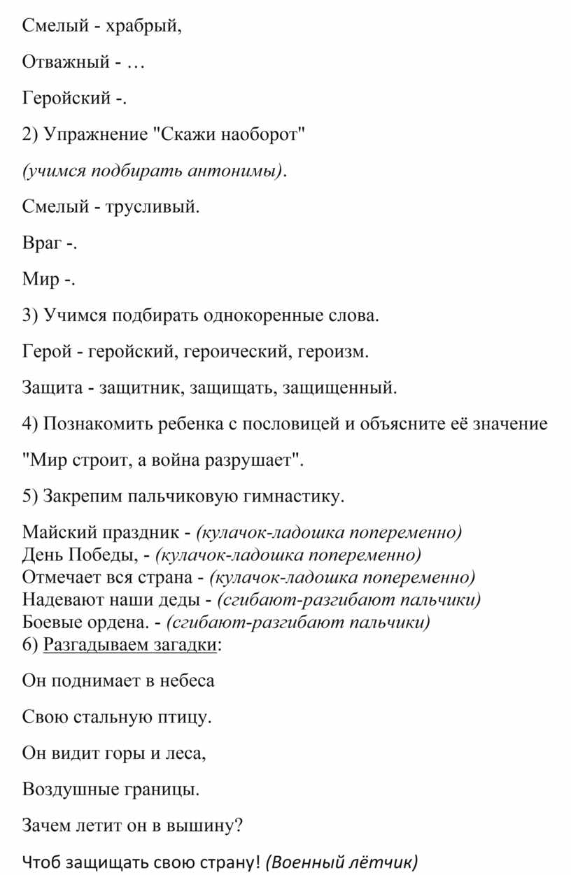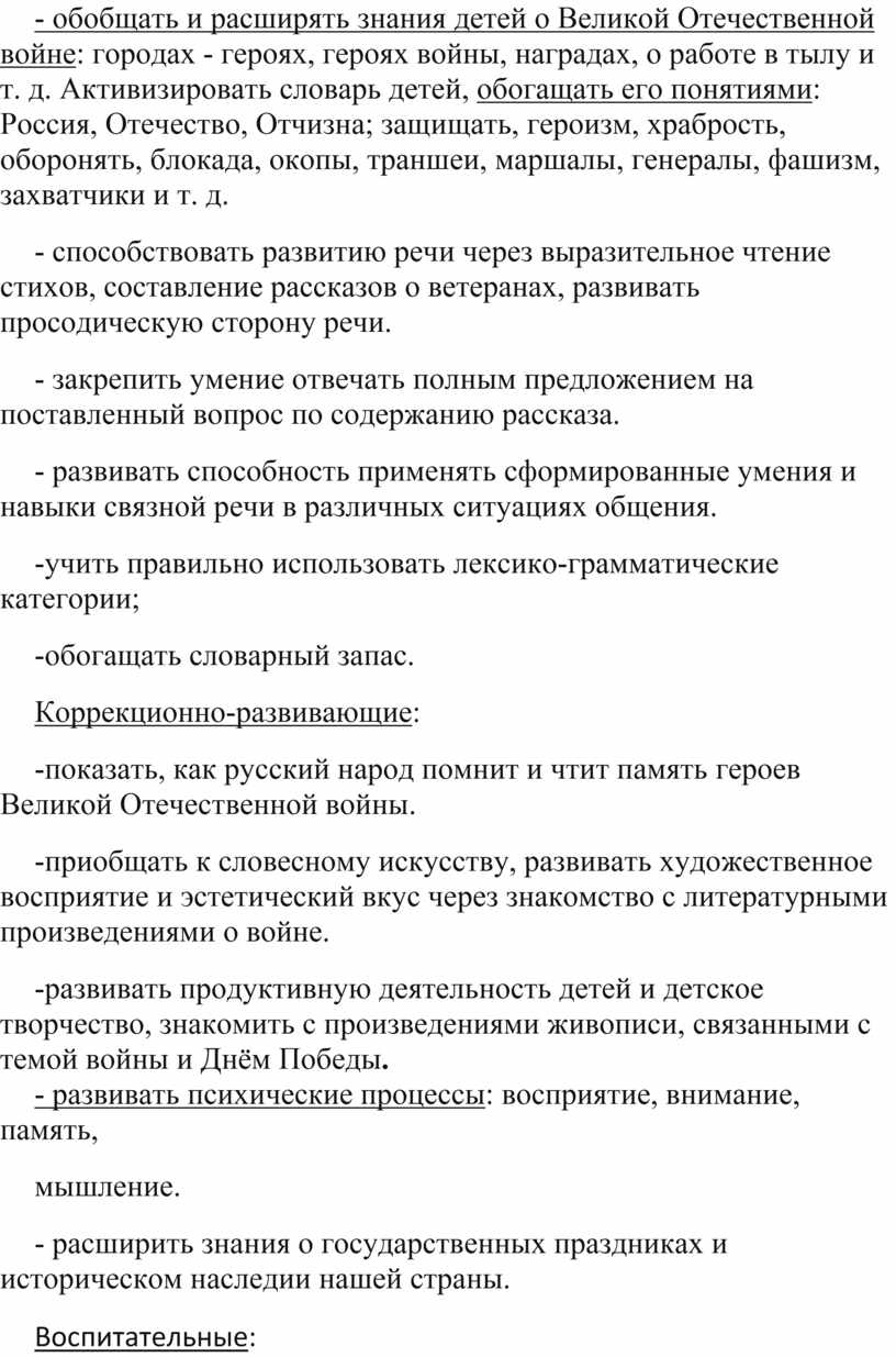 - обобщать и расширять знания детей о Великой Отечественной войне: городах - героях, героях войны, наградах, о работе в тылу и т. д. Активизировать словарь детей, обогащать его понятиями: Россия, Отечество, Отчизна; защищать, героизм, храбрость, оборонять, блокада, окопы, траншеи, маршалы, генералы, фашизм, захватчики и т. д.