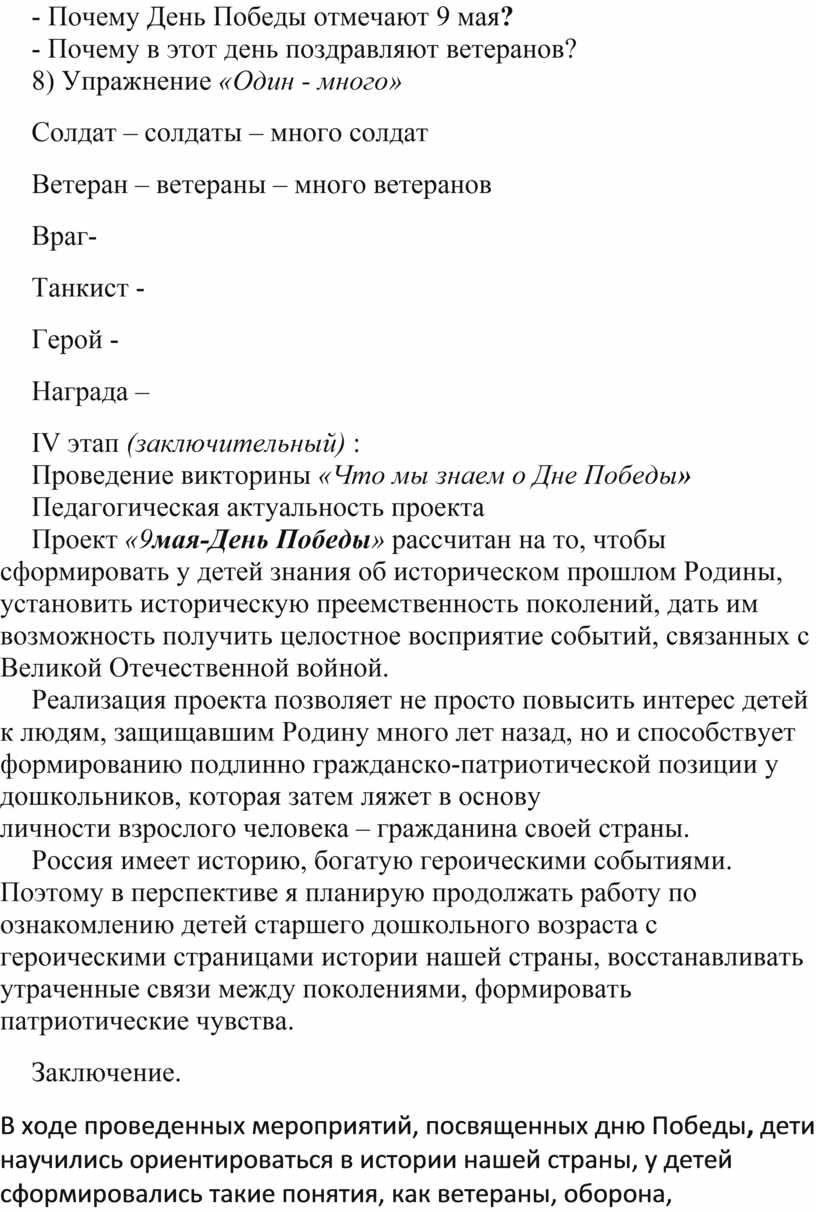 В ходе проведенных мероприятий, посвященных дню Победы, дети научились ориентироваться в истории нашей страны, у детей сформировались такие понятия, как ветераны, оборона, захватчики, фашисты, фашистская Германия; сформировалось чувство гордости за свой народ и его боевые заслуги; уважение к защитникам Отечества, ветеранам Великой Отечественной войны.