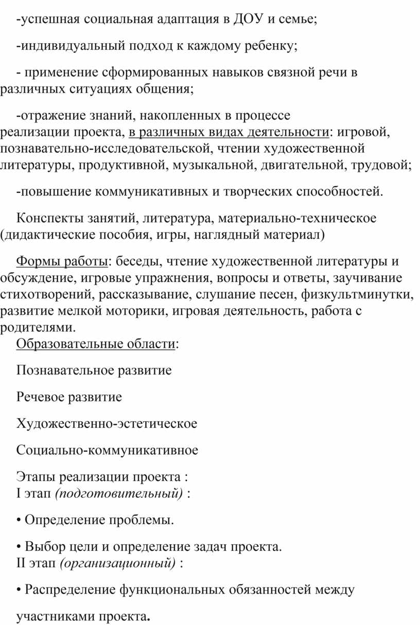 Формы работы: беседы, чтение художественной литературы и обсуждение, игровые упражнения, вопросы и ответы, заучивание стихотворений, рассказывание, слушание песен, физкультминутки, развитие мелкой моторики, игровая деятельность, работа с родителями.