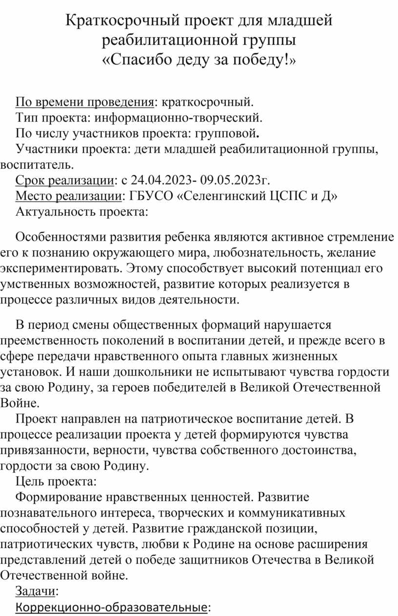 Краткосрочный проект для младшей реабилитационной группы «Спасибо деду за победу!»