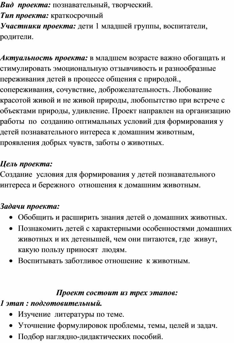 Актуальность проекта: в младшем возрасте важно обогащать и стимулировать эмоциональную отзывчивость и разнообразные переживания детей в процессе общения с природой., сопереживания, сочувствие, доброжелательность. Любование красотой живой и не живой природы, любопытство при встрече с объектами природы, удивление. Проект направлен на организацию работы по созданию оптимальных условий для формирования у детей познавательного интереса к домашним животным, проявления добрых чувств, заботы о животных.