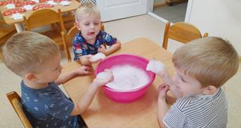 Цель: познакомить детей со свойством пены: «воздушная», «легкая», «белая», развивать познавательную активность и любознательность.