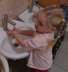 Оборудование: ёмкость для воды, мыло. Ход проведения: Педагог говорит о том, что перед приёмом пищи нам надо помыть руки мылом, намыливает руки мылом до появления пены (показ детям). Говорит о том, что у неё на руках белые «перчатки» и предлагает детям тоже намылить руки. Дети намыливают руки мылом до появления пены. Проговаривают: «Моем, моем, моем – чисто, чисто, чисто, Будут ручки чисты, чисты, чисты». Дети наблюдают за тем, что на ручках у них белая, воздушная и легкая пена. Смывают её водой и вытирают руки полотенцем.