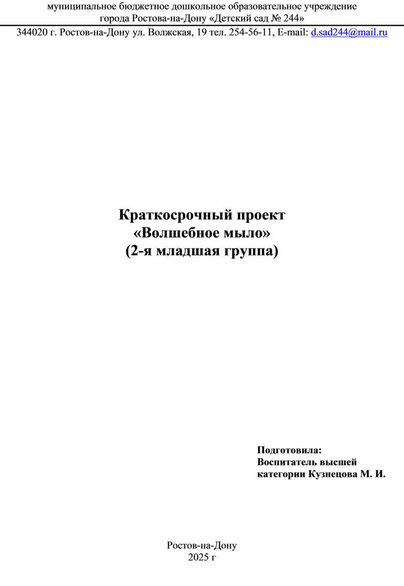 344020 г. Ростов-на-Дону ул. Волжская, 19 тел. 254-56-11, E-mail: d.sad244@mail.ru