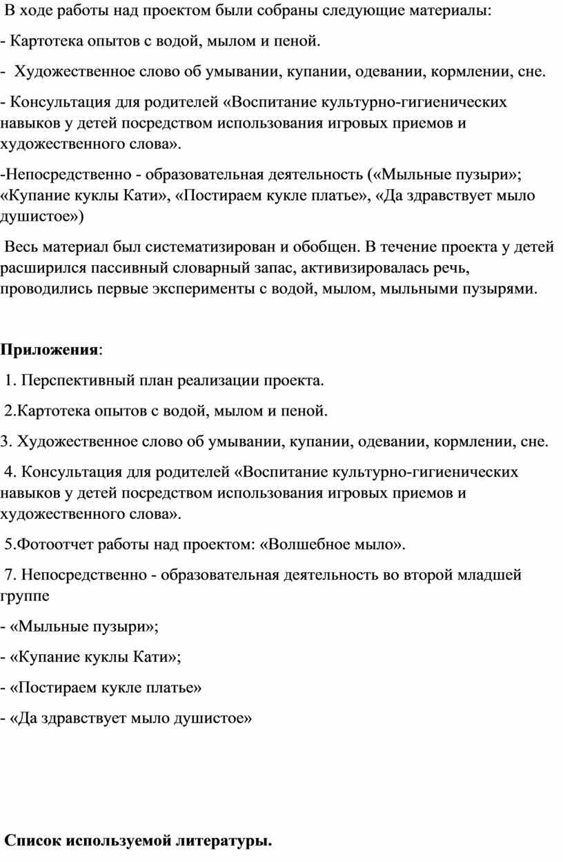 Весь материал был систематизирован и обобщен. В течение проекта у детей расширился пассивный словарный запас, активизировалась речь, проводились первые эксперименты с водой, мылом, мыльными пузырями.