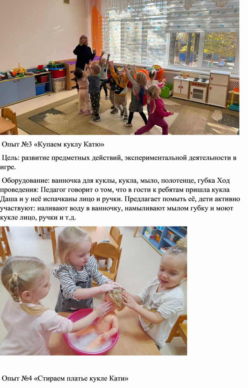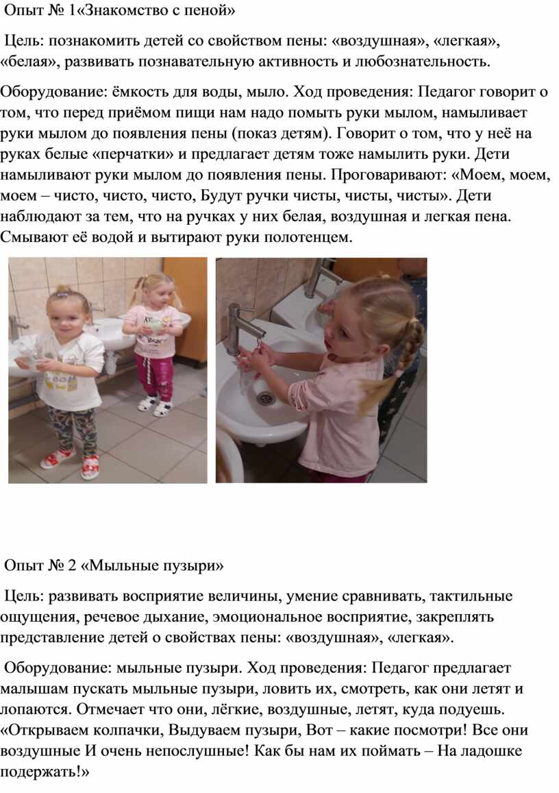 . Оборудование: ёмкость, платье куклы, мыло. Ход проведения Педагог показывает детям платье и говорит о том, что оно испачкано, ребята говорят о том, что его надо постирать. В ёмкость с водой кладут платье и берут мыло, начинают намыливать платье и стирать его. Образовывается пена от мыла и дети стирают платье и замечают, что оно стало чистым.