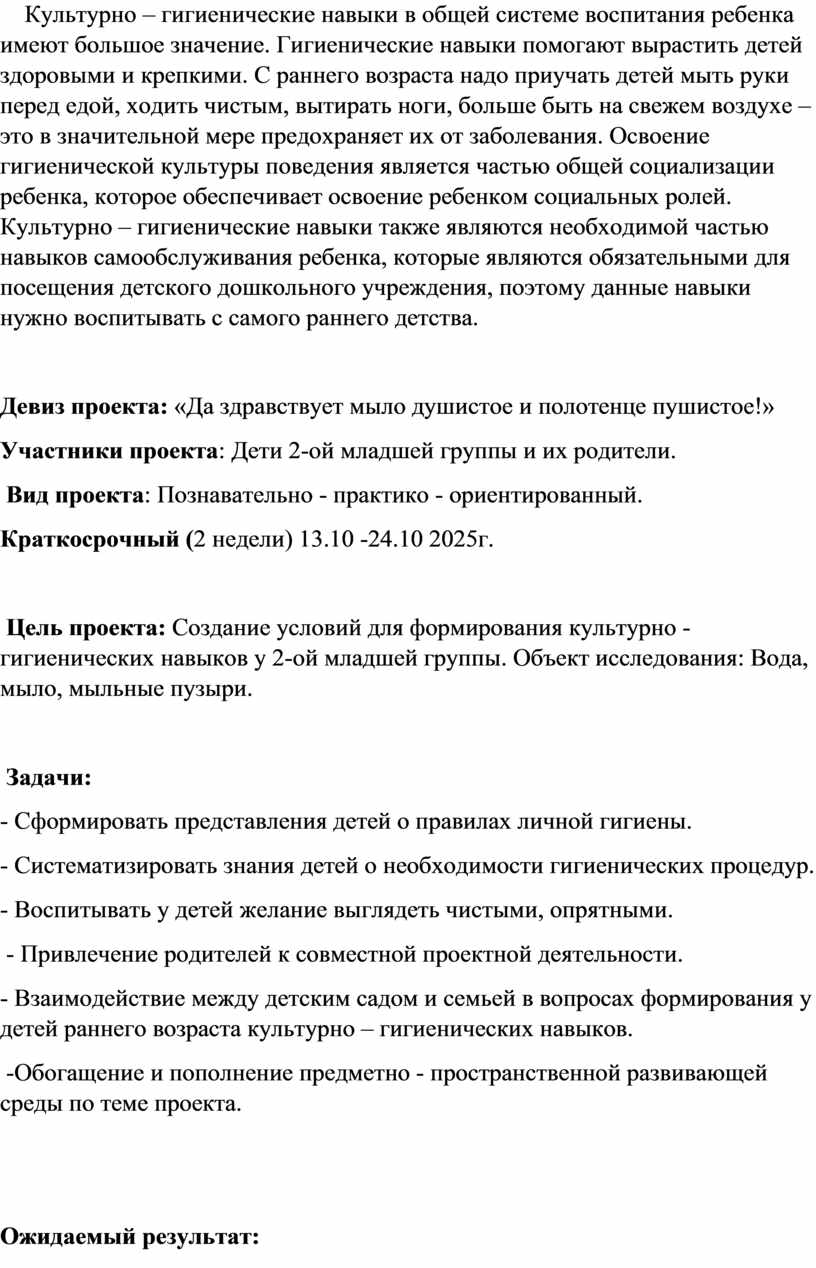 Цель проекта: Создание условий для формирования культурно - гигиенических навыков у 2-ой младшей группы. Объект исследования: Вода, мыло, мыльные пузыри.