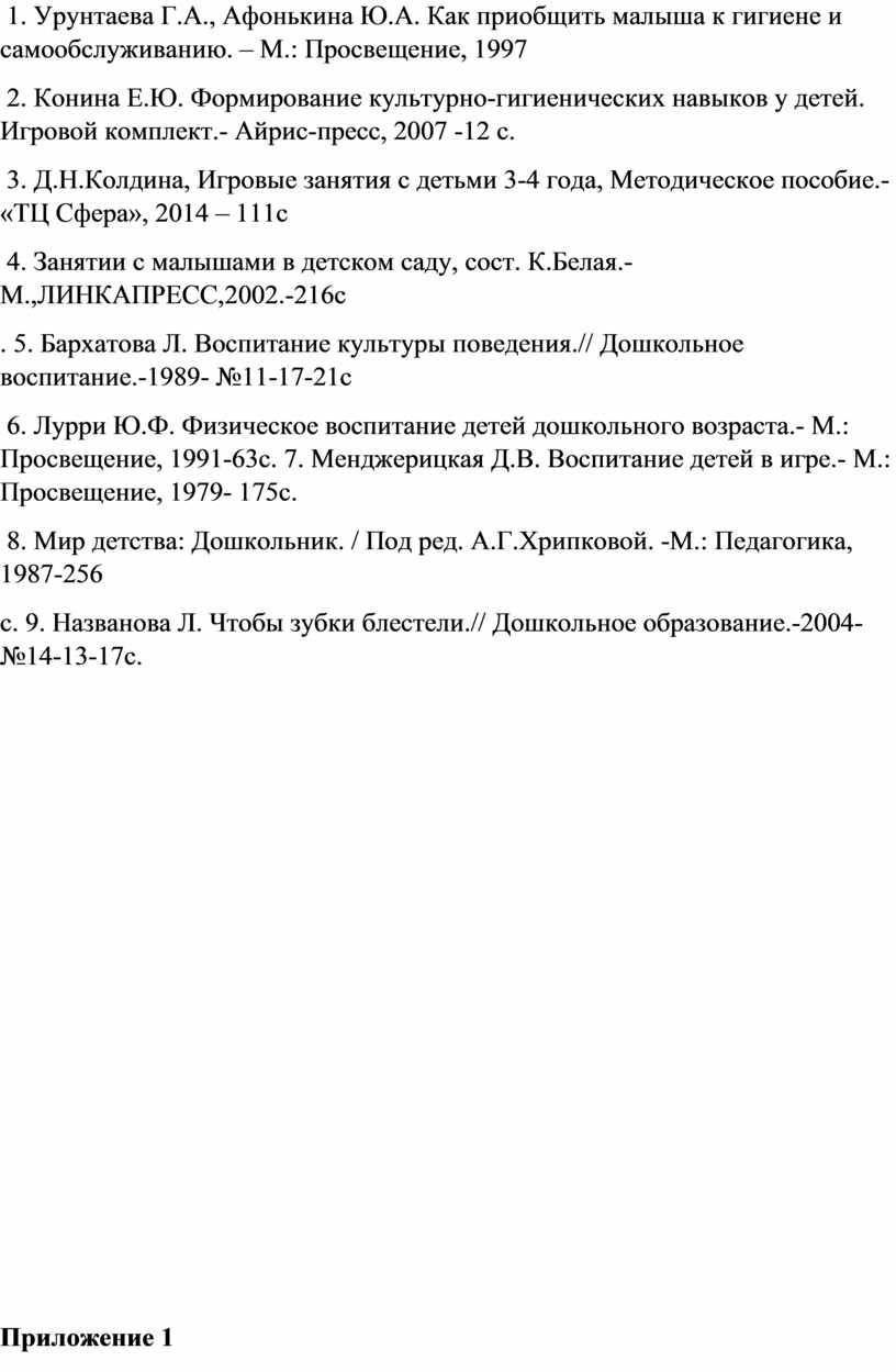 1. Урунтаева Г.А., Афонькина Ю.А. Как приобщить малыша к гигиене и самообслуживанию. – М.: Просвещение, 1997