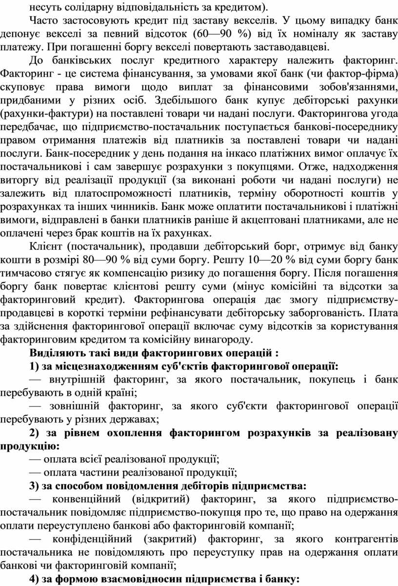 До банківських послуг кредитного характеру належить факторинг. Факторинг - це система фінансування, за умовами якої банк (чи фактор-фірма) скуповує права вимоги щодо виплат за фінансовими зобов'язаннями, придбаними у різних осіб. Здебільшого банк купує дебіторські рахунки (рахунки-фактури) на поставлені товари чи надані послуги. Факторингова угода передбачає, що підприємство-постачальник поступається банкові-посереднику правом отримання платежів від платників за поставлені товари чи надані послуги. Банк-посередник у день подання на інкасо платіжних вимог оплачує їх постачальникові і сам завершує розрахунки з покупцями. Отже, надходження виторгу від реалізації продукції (за виконані роботи чи надані послуги) не залежить від платоспроможності платників, терміну оборотності коштів у розрахунках та інших чинників. Банк може оплатити постачальникові і платіжні вимоги, відправлені в банки платників раніше й акцептовані платниками, але не оплачені через брак коштів на їх рахунках.