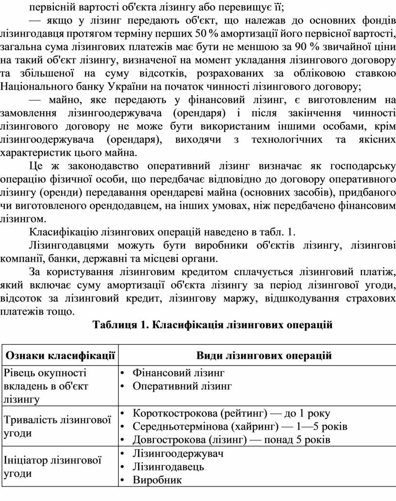 Це ж законодавство оперативний лізинг визначає як господарську операцію фізичної особи, що передбачає відповідно до договору оперативного лізингу (оренди) передавання орендареві майна (основних засобів), придбаного чи виготовленого орендодавцем, на інших умовах, ніж передбачено фінансовим лізингом.