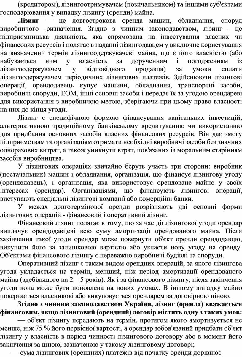 Лізинг — це довгострокова оренда машин, обладнання, споруд виробничого -ризначення. Згідно з чинним законодавством, лізинг - це підприємницька діяльність, яка спрямована на інвестування власних чи фінансових ресурсів і полягає в наданні лізингодавцем у виключне користування на визначений термін лізингоодержувачеві майна, що є його власністю (або набувається ним у власність за дорученням і погодженням із лізингоодержувачем у відповідного продавця) за умови сплати лізингоодержувачем періодичних лізингових платежів. Здійснюючи лізингові операції, орендодавець купує машини, обладнання, транспортні засоби, виробничі споруди, ЕОМ, інші основні засоби і передає їх за угодою орендареві для використання з виробничою метою, зберігаючи при цьому право власності на них до кінця угоди.