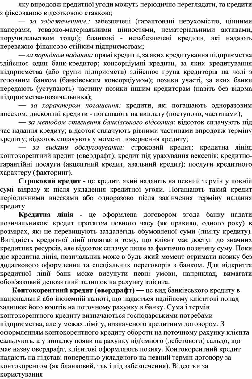 — за видами обслуговування: строковий кредит; кредитна лінія; контокорентний кредит (овердрафт); кредит під урахування векселів; кредитно-гарантійні послуги (акцептний кредит, авальний кредит); послуги кредитного характеру (факторинг).