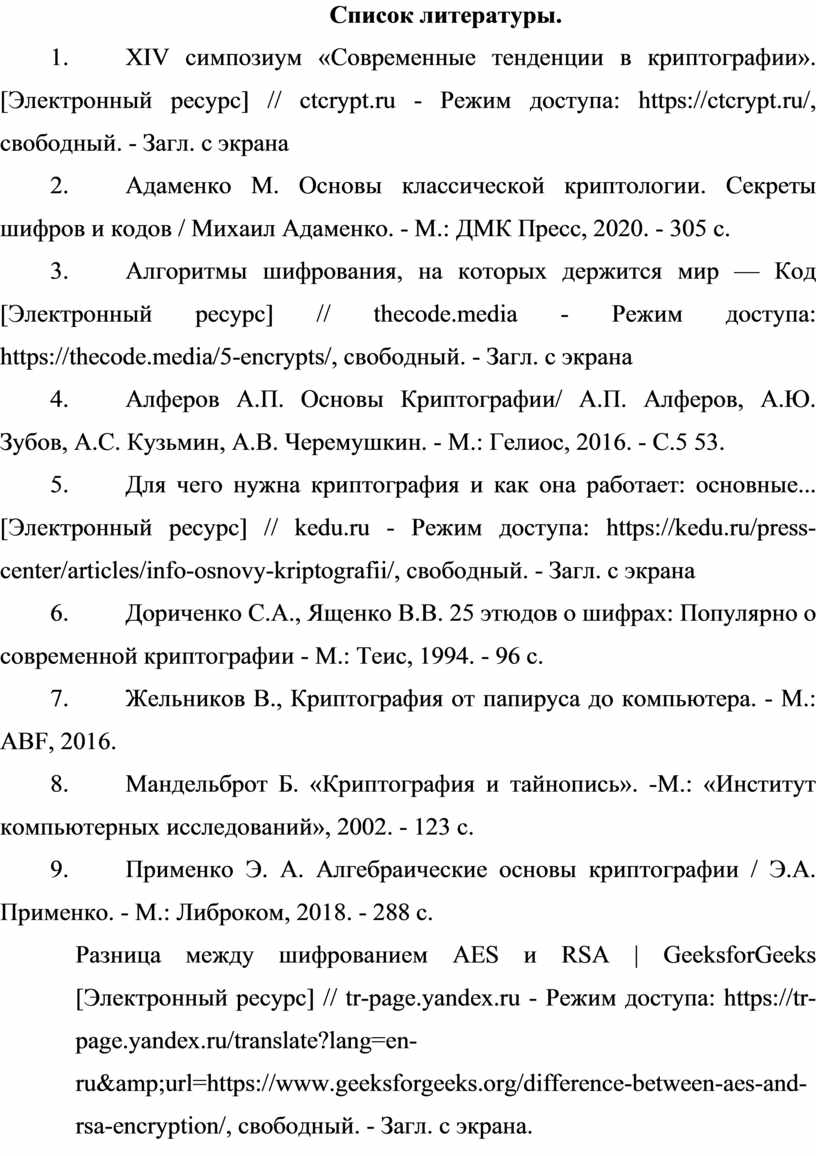 10. Разница между шифрованием AES и RSA | GeeksforGeeks [Электронный ресурс] // tr-page.yandex.ru - Режим доступа: https://tr-page.yandex.ru/translate?lang=en-ru&url=https://www.geeksforgeeks.org/difference-between-aes-and-rsa-encryption/, свободный. - Загл. с экрана.