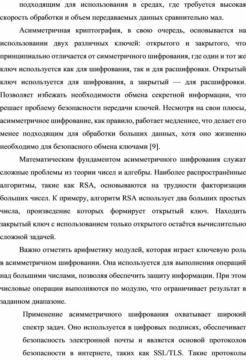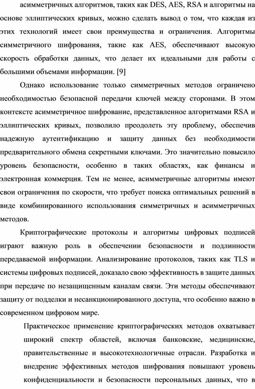 В ходе проведенного исследования были рассмотрены ключевые аспекты криптографии, включая математические основы, алгоритмы шифрования и протоколы безопасности, а также их практическое применение в различных сферах. Проанализировав основные виды симметричных и асимметричных алгоритмов, таких как DES, AES, RSA и алгоритмы на основе эллиптических кривых, можно сделать вывод о том, что каждая из этих технологий имеет свои преимущества и ограничения. Алгоритмы симметричного шифрования, такие как AES, обеспечивают высокую скорость обработки данных, что делает их идеальными для работы с большими объемами информации. [9]