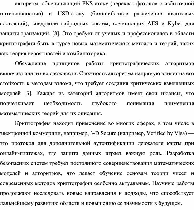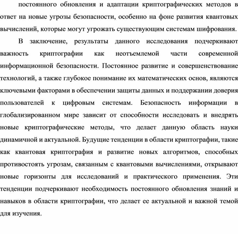 В заключение, результаты данного исследования подчеркивают важность криптографии как неотъемлемой части современной информационной безопасности. Постоянное развитие и совершенствование технологий, а также глубокое понимание их математических основ, являются ключевыми факторами в обеспечении защиты данных и поддержании доверия пользователей к цифровым системам. Безопасность информации в глобализированном мире зависит от способности исследовать и внедрять новые криптографические методы, что делает данную область науки динамичной и актуальной. Будущие тенденции в области криптографии, такие как квантовая криптография и развитие новых алгоритмов, способных противостоять угрозам, связанным с квантовыми вычислениями, открывают новые горизонты для исследований и практического применения. Эти тенденции подчеркивают необходимость постоянного обновления знаний и навыков в области криптографии, что делает ее актуальной и важной темой для изучения.