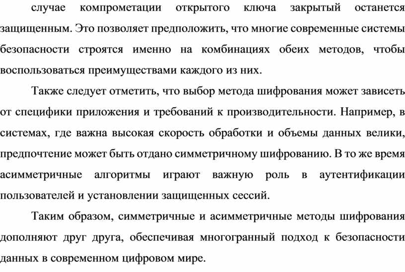 Также следует отметить, что выбор метода шифрования может зависеть от специфики приложения и требований к производительности. Например, в системах, где важна высокая скорость обработки и объемы данных велики, предпочтение может быть отдано симметричному шифрованию. В то же время асимметричные алгоритмы играют важную роль в аутентификации пользователей и установлении защищенных сессий.