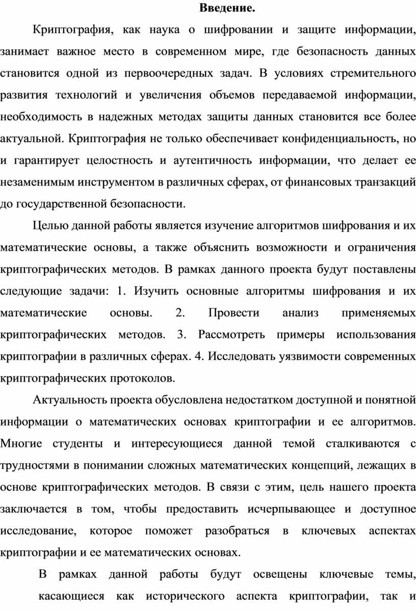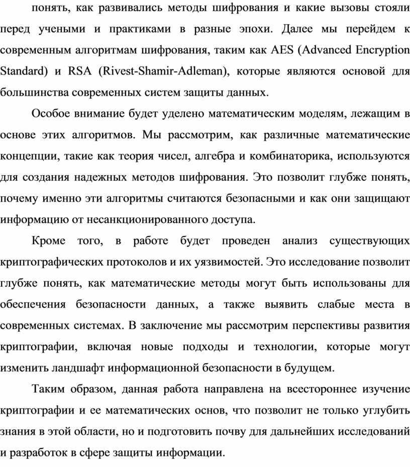 Таким образом, данная работа направлена на всестороннее изучение криптографии и ее математических основ, что позволит не только углубить знания в этой области, но и подготовить почву для дальнейших исследований и разработок в сфере защиты информации.