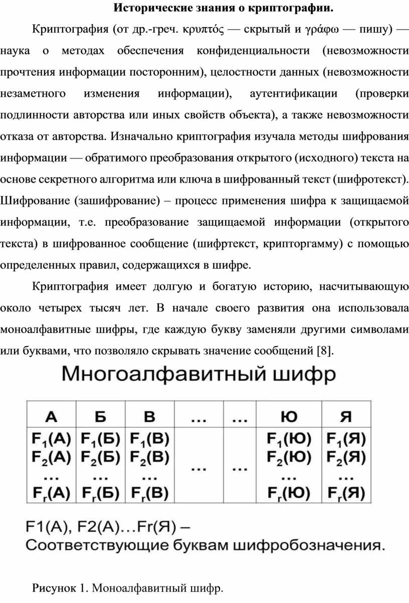 Криптография (от др.-греч. κρυπτός — скрытый и γράφω — пишу) — наука о методах обеспечения конфиденциальности (невозможности прочтения информации посторонним), целостности данных (невозможности незаметного изменения информации), аутентификации (проверки подлинности авторства или иных свойств объекта), а также невозможности отказа от авторства. Изначально криптография изучала методы шифрования информации — обратимого преобразования открытого (исходного) текста на основе секретного алгоритма или ключа в шифрованный текст (шифротекст). Шифрование (зашифрование) – процесс применения шифра к защищаемой информации, т.е. преобразование защищаемой информации (открытого текста) в шифрованное сообщение (шифртекст, крипторгамму) с помощью определенных правил, содержащихся в шифре.