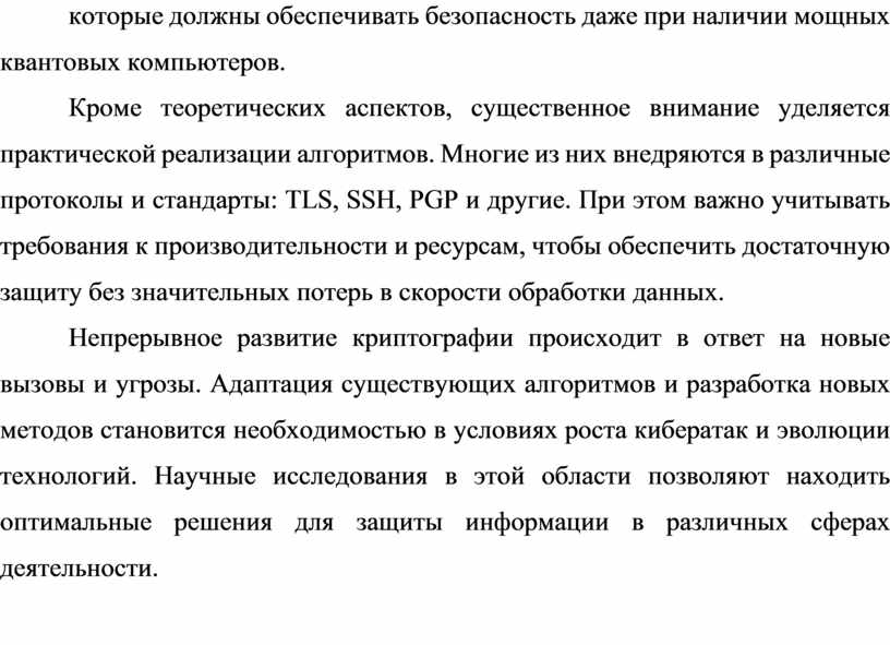Непрерывное развитие криптографии происходит в ответ на новые вызовы и угрозы. Адаптация существующих алгоритмов и разработка новых методов становится необходимостью в условиях роста кибератак и эволюции технологий. Научные исследования в этой области позволяют находить оптимальные решения для защиты информации в различных сферах деятельности.