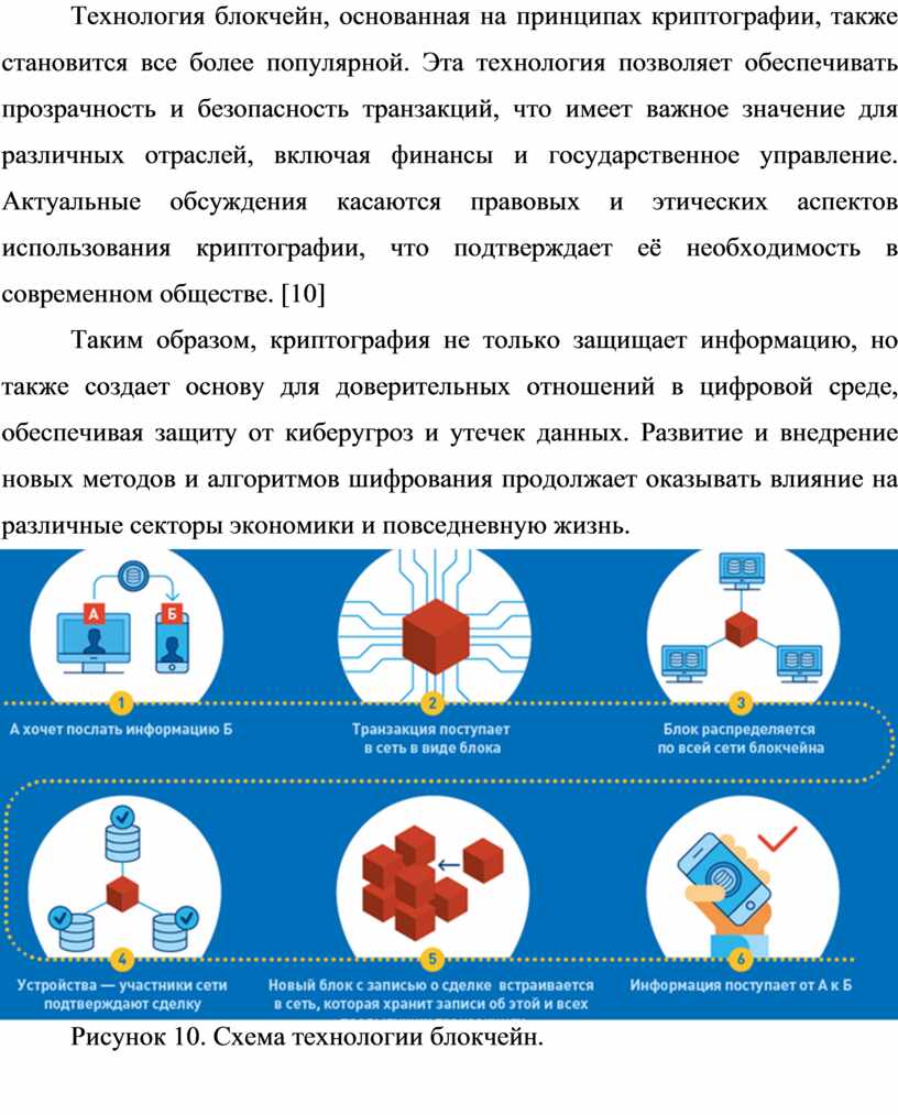 В дополнение к традиционным отраслям, криптография также находит применение в новых и развивающихся технологий, таких как блокчейн. Технология блокчейн, основанная на принципах криптографии, также становится все более популярной. Эта технология позволяет обеспечивать прозрачность и безопасность транзакций, что имеет важное значение для различных отраслей, включая финансы и государственное управление. Актуальные обсуждения касаются правовых и этических аспектов использования криптографии, что подтверждает её необходимость в современном обществе. [10]