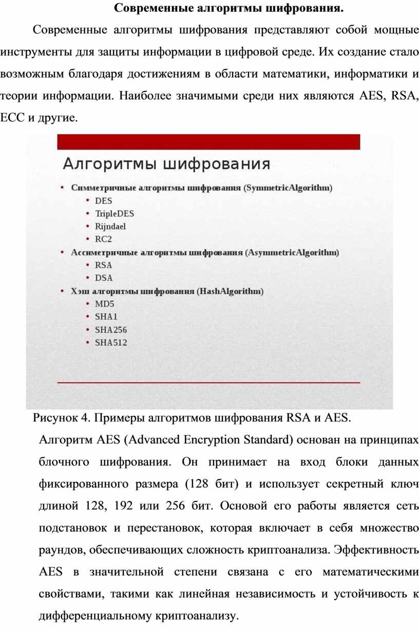 Рисунок 4. Примеры алгоритмов шифрования RSA и AES.