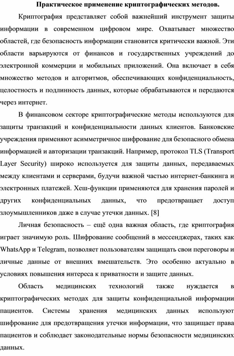 Практическое применение криптографических методов охватывает широкий спектр областей, включая банковские, медицинские, правительственные и высокотехнологичные отрасли. Разработка и внедрение эффективных методов шифрования повышают уровень конфиденциальности и безопасности персональных данных, что в современных условиях является критически важным. Однако важным аспектом остается необходимость постоянного обновления и адаптации криптографических методов в ответ на новые угрозы безопасности, особенно на фоне развития квантовых вычислений, которые могут угрожать существующим системам шифрования.